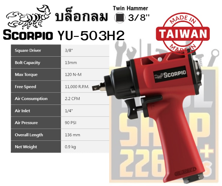 บล็อกลม SCORPIO YU-503H2 เป็นเครื่องยิงบ๊อกลมขนาด 3/8 นิ้วแบบ Twin Hammer เหมาะสำหรับงานขันและคลายน็อตในอู่ซ่อมรถหรือโรงงานอุตสาหกรรม