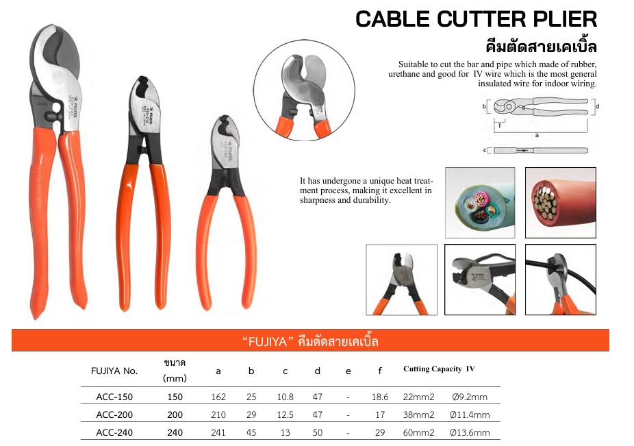 คีมตัดสายเคเบิ้ล (Cable Cutter Plier) แบรนด์ FUJIYA จากประเทศญี่ปุ่น ซึ่งเป็นเครื่องมือที่ผ่านกระบวนการชุบแข็ง (heat treatment) ทำให้มีความคมและทนทานสูง เหมาะสำหรับใช้ตัดสายไฟประเภท IV (สายไฟฟ้าหุ้มฉนวนทั่วไปที่ใช้เดินภายในอาคาร) รวมถึงแท่งหรือท่อที่ทำจากยางและยูรีเทน