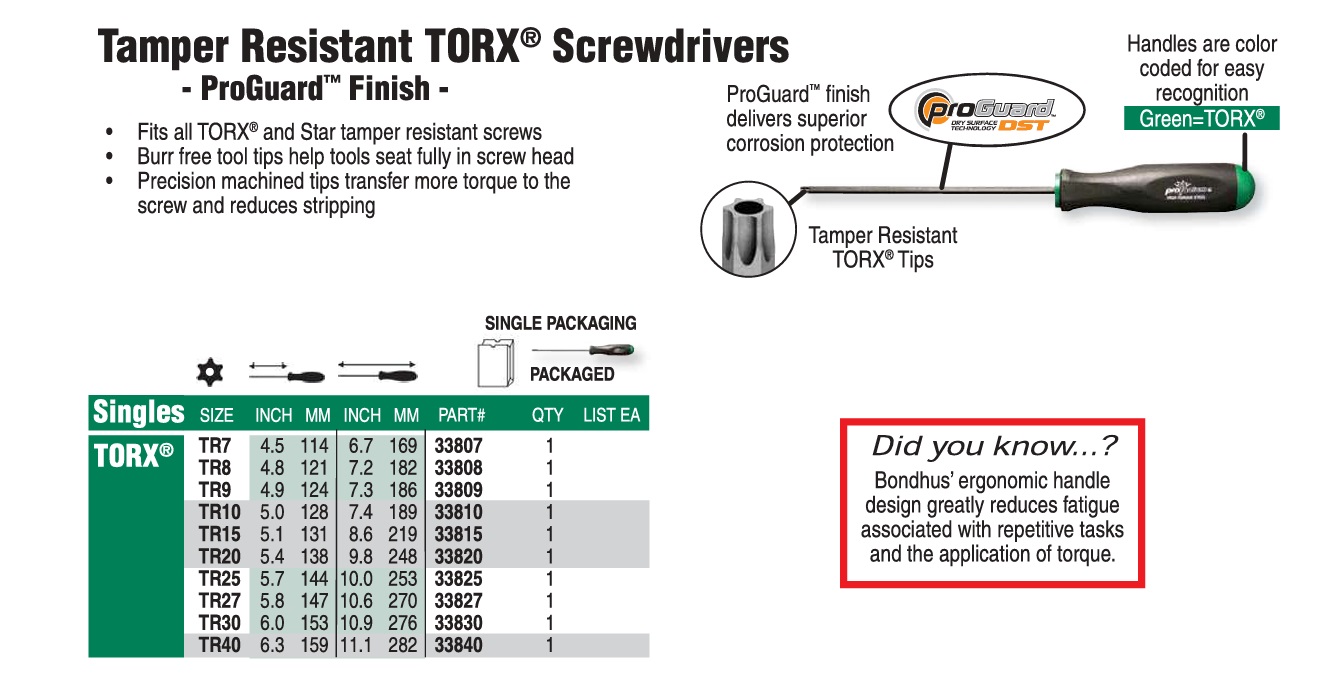 ประแจหกเหลี่ยม หัวทอร์ค Tamper Proof Torx Tip Screwdriver T6-T40 Bondhus