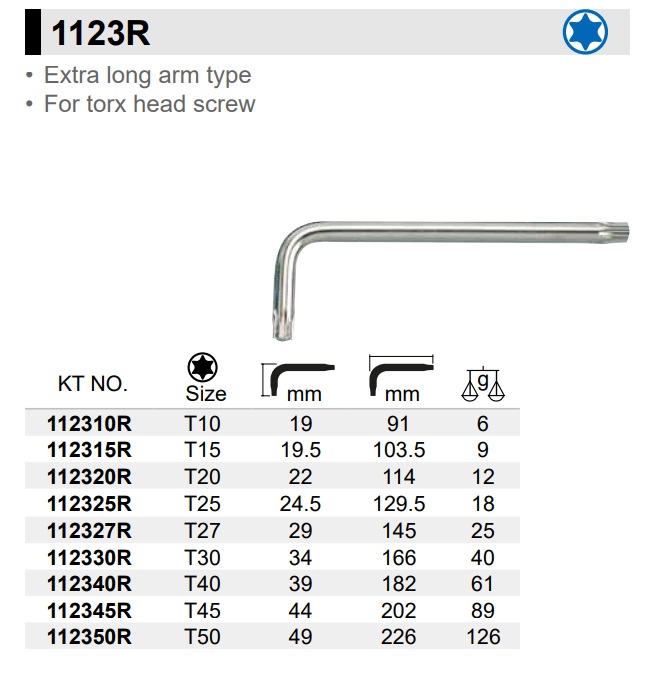 ประแจแอล หัวท็อค ยาวสีขาว T10-T50 Star L - Wrench (Extra long type) 1123R KINGTONY