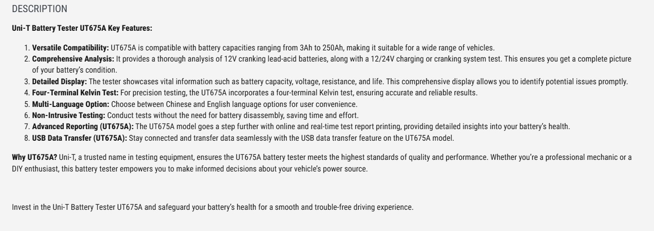 เครื่องมือทดสอบแบตเตอรี่รถยนต์ พิมพ์ได้ 12V/24V Acid วัดแบต CCA Uni-T Battery Tester UT675A