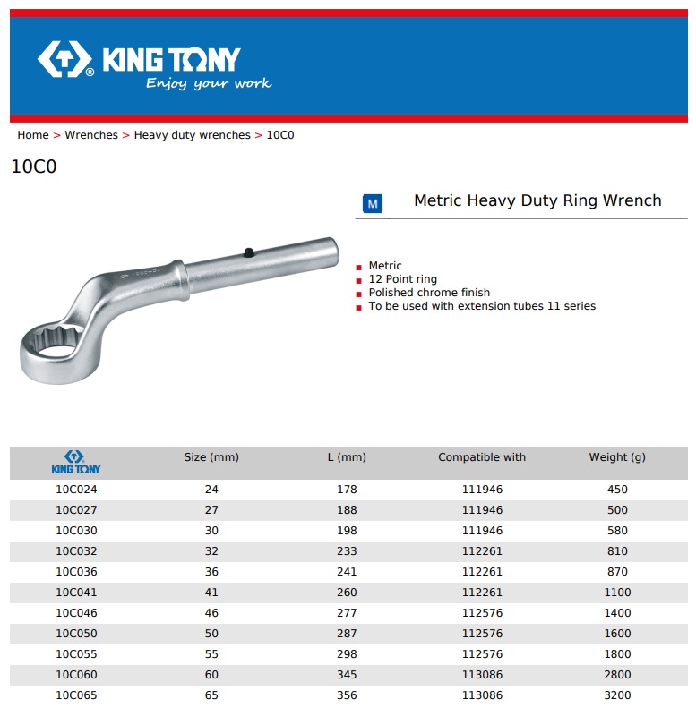 ประแจแหวน หัวเดี่ยว แบบเยอรมันชุบขาว KINGTONY 10C0 Metric Heavy Duty Ring Wrench