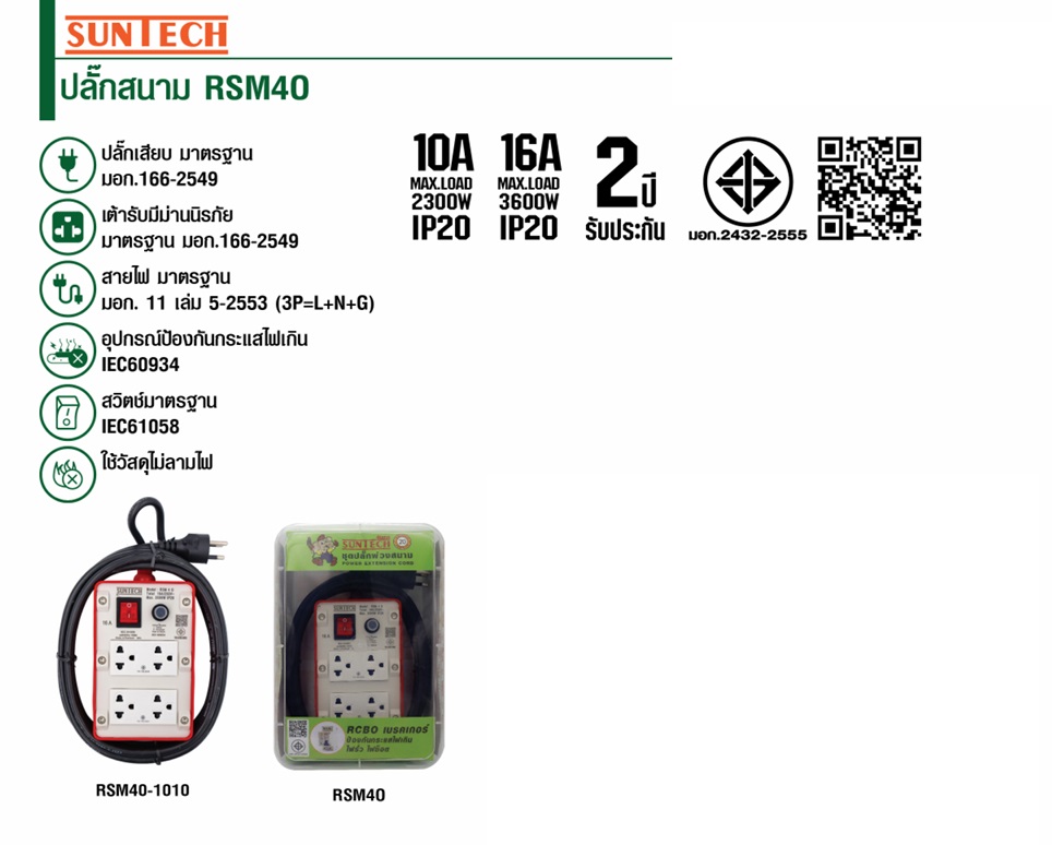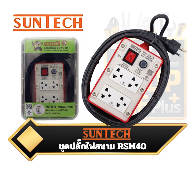 ปลั๊กพ่วงสนาม Suntech RSM40 เป็นชุดปลั๊กไฟที่ออกแบบมาเพื่อใช้งานทั้งภายในและภายนอกอาคาร มีความทนทานและปลอดภัยสูง ผลิตภัณฑ์นี้มีหลายรุ่นย่อย โดยรุ่นมาตรฐานสามารถทนกระแสไฟฟ้าได้สูงสุด 10A หรือ 16A และรองรับกำลังไฟสูงสุด 2200W หรือ 3600W ตามลำดับ