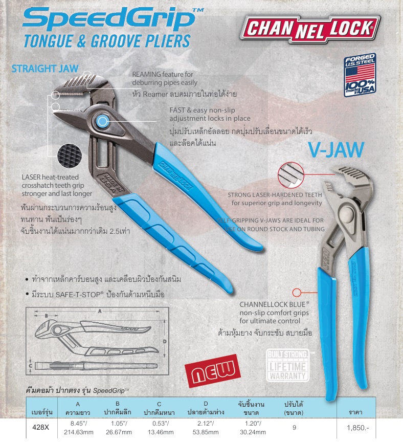 คีมคอม้าปากตรง 8.45" 428X 8-inch SPEEDGRIP Straight Jaw Tongue & Groove Pliers CHANNELLOCK