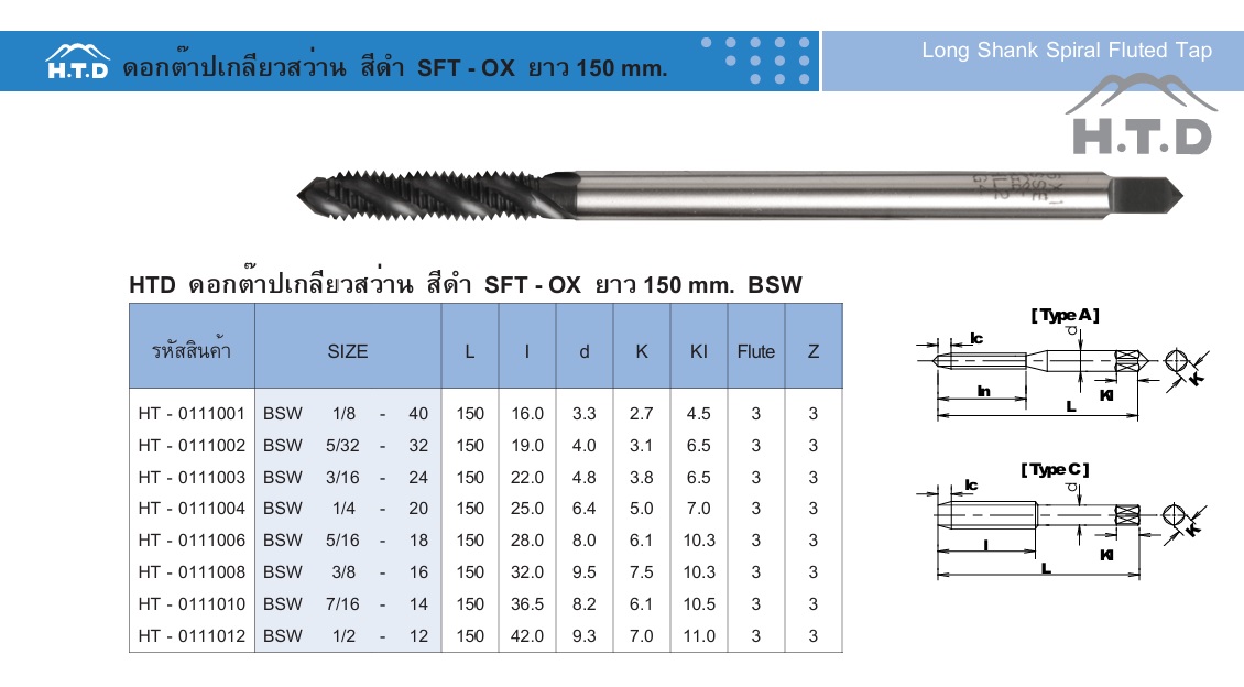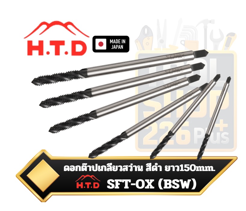 ดอกต๊าปเกลียวสว่าน สีดำ ตราภูเขา SFT-OX ยาวพิเศษ 150mm.Spiral Fluted Taps extra-long 150mm. H.T.D เกลียว B.S.W
