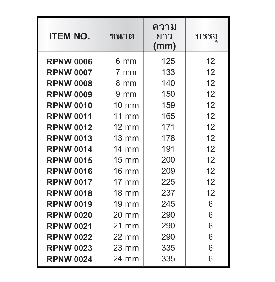 ขนาด: มีจำหน่ายหลายขนาดให้เลือกใช้งานตั้งแต่ 6 มม. ถึง 24 มม.