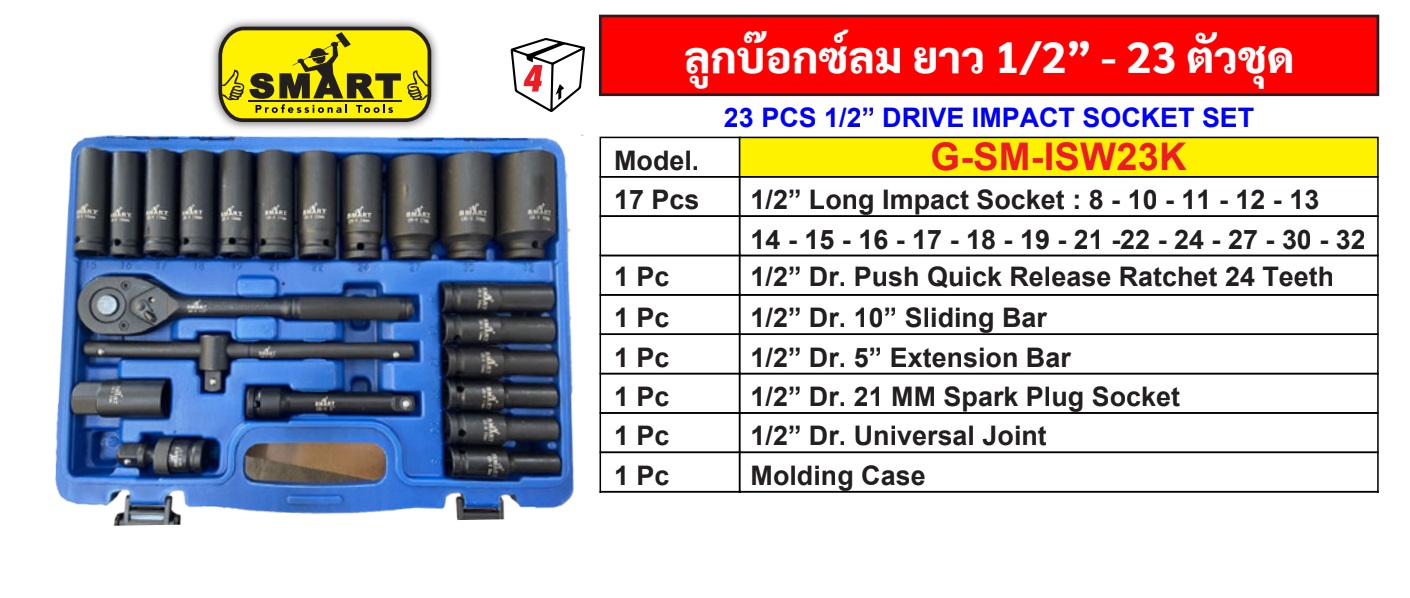 ลูกบล็อกลมยาว 1/2" -23 ตัวชุด รุ่น G-SM-ISW23K SMART Professional Tools