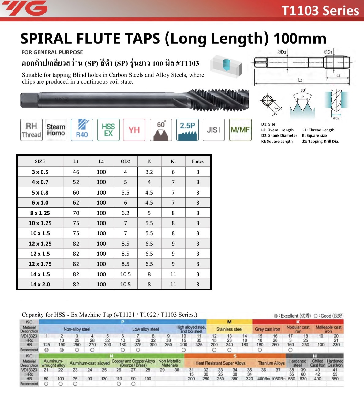 ํYG ดอกต๊าปเกลียวสว่าน ยาวพิเศษ 100mm. SPLS T1103 Spiral Flute Tap Extra Long 100mm.