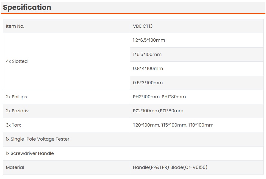 จำนวนชิ้น: 13 ชิ้น (รวมด้ามและไขควงลองไฟ)