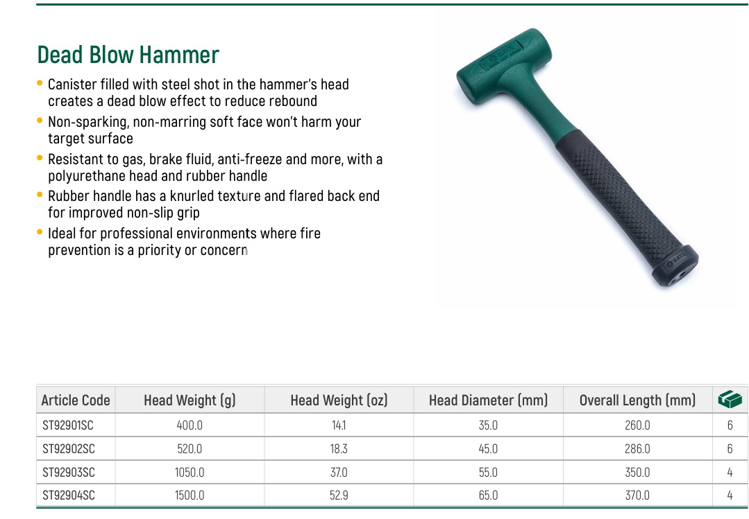 SATA ค้อนหัวยูรีเทนไร้แรงสะท้อน (Dead Blow Hammer) ขนาดหัวค้อน 35,45,55,65 มิลลิเมตร ที่มีความทนทานต่อการขีดข่วนและน้ำมัน