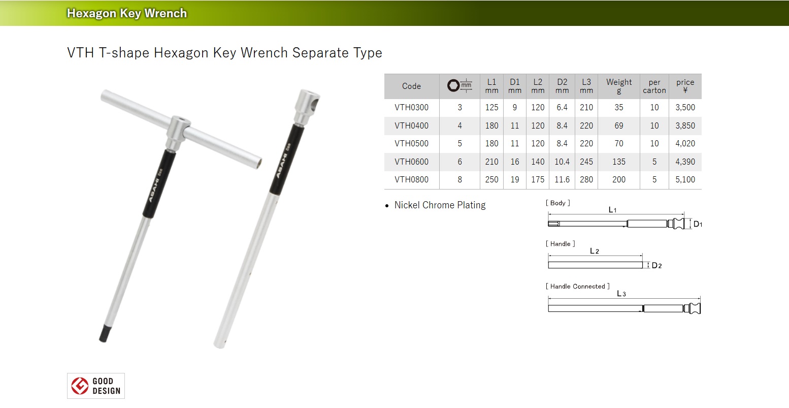 ประแจหกเหลี่ยมตัวที ASAHI VTH T-shape Hexagon Key Wrench Separate Type quick turn 3~8mm Japan