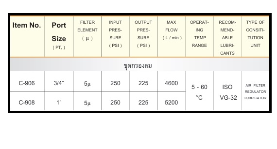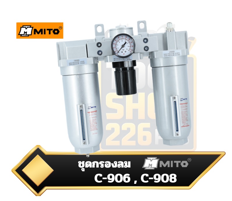 ชุดกรองลม (Air Filter Regulator Lubricator หรือ F.R.L. Units) แบรนด์ MITO รุ่น C-906 และ C-908 ซึ่งเป็นอุปกรณ์สำคัญในระบบนิวแมติกส์เพื่อปรับปรุงคุณภาพลมก่อนนำไปใช้งาน