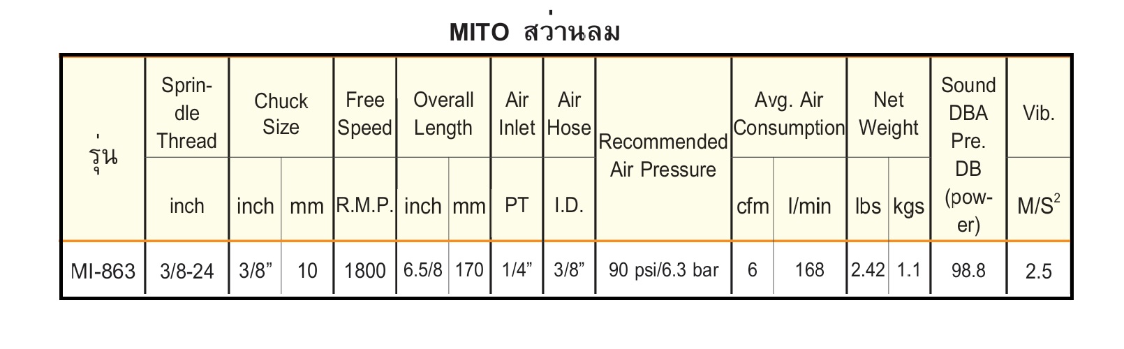 สว่านลม MITO รุ่น MI-863ความเร็วรอบสูงสุด: 1800 รอบต่อนาทีขนาดหัวจับดอกสว่าน: 3/8 นิ้ว (10 มม.)แรงดันลมที่แนะนำ: 90 psi / 6.3 barอัตราการใช้ลมเฉลี่ย: 6 cfm (168 ลิตร/นาที)น้ำหนักสุทธิ: 1.1 กิโลกรัม